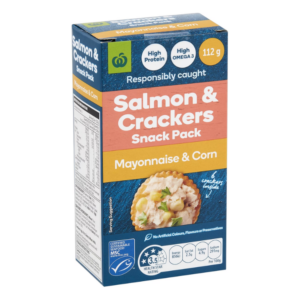 Convenient snack pack combining omega-3 rich salmon with crunchy crackers